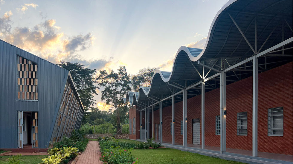 The structure of the building is made up of reinforced concrete beams, columns, and a small amount of steel framing. The building envelope and roof are made of locally manufactured galvanized corrugated tin sheets. The second-floor corridor and roof are supported by Y-shaped exterior steel columns.