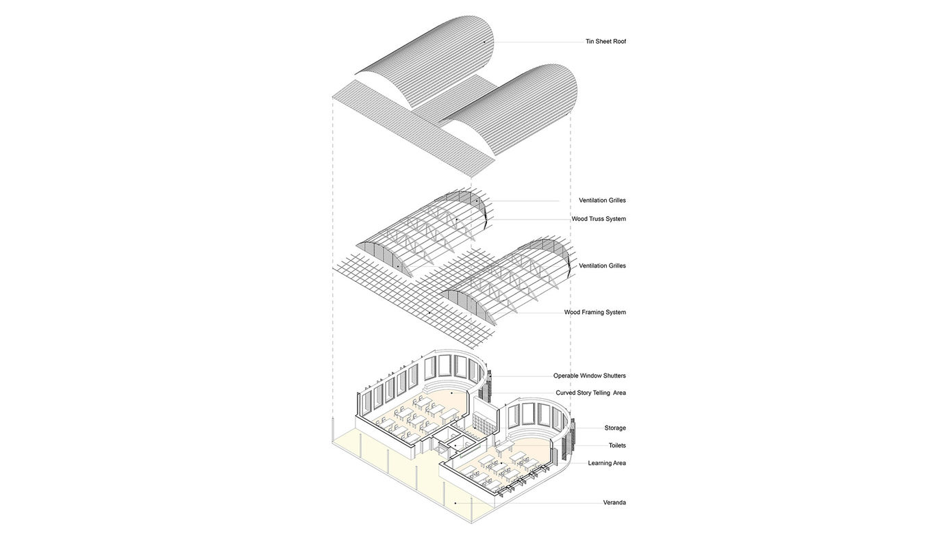 Primary School classroom addition is located on the north side of the site, creating a central play area and shared gathering space for students. Covered connectors link buildings and serve as shaded circulation paths and assembly areas. Classrooms and administrative offices open onto a central courtyard, allowing clear supervision of student movement between classrooms and the playground. A secondary inward-facing courtyard between the classroom wing and dining/multifunction building provides a protected gathering space during hot or inclement weather. The playground is positioned on the west side of the site with direct access from the covered walkways, while large shade trees help cool the courtyards. Rainwater is collected from roof gutters, stored underground, and reused as greywater for toilet flushing with the help of solar-powered pumping. The project incorporates solar panels, water-efficient fixtures, and locally sourced construction materials, including brick infill, timber roof trusses, and metal roofing, to support sustainable and community-focused design.